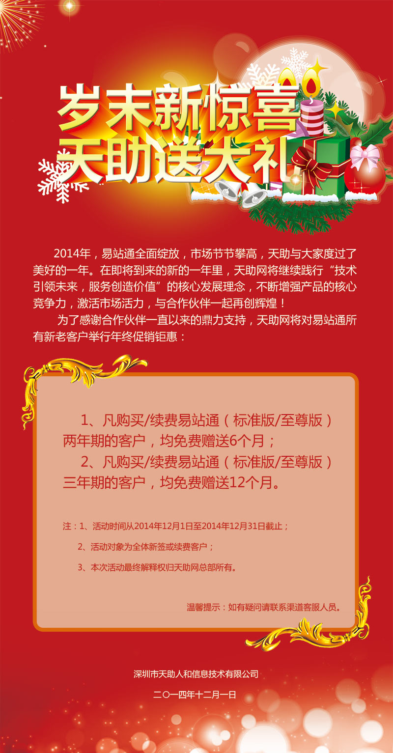 【岁末新惊喜 华企天助送大礼】为了感谢合作伙伴一直以来的鼎力支持,本公司将在2014年12月1日至2014年12月31日期间,对易站通所有新老客户举行年终钜惠。凡购买/续费易站通(标准版/至尊版)两年期的客户,均免费赠送6个月;凡购买/续费易站通(标准版/至尊版)三年期的客户,均免费赠送12个月,多买多送 详情请咨询:13590451607